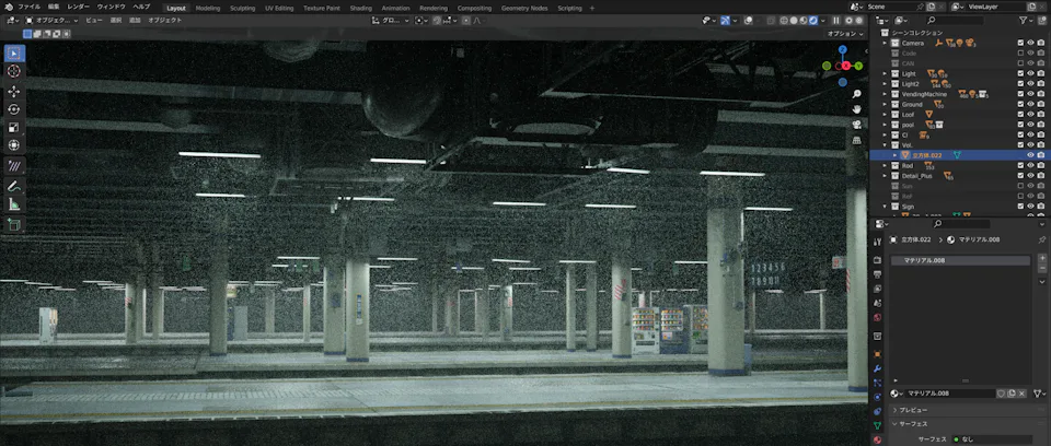Underground walkways (e.g., C-08) are produced so that the lighting is constant and simple in composition at any angle. In addition, by masking the illustrations loaded in planes on the 3D scene and preparing area lights in between, the luminescence of the devices is made to look natural. The creativity and ingenuity of the processing reduces the sense of discomfort in the composition.