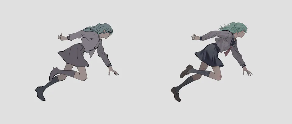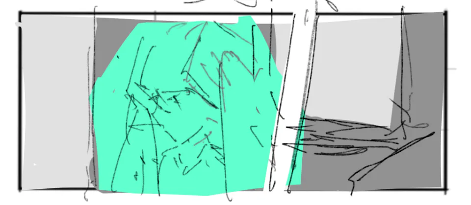 The perspective and posing are determined in the storyboard, a rough sketch is created accordingly, and details are adjusted by applying them to the CG. Finally, texture and other adjustments are made, and the final illustration is created to be combined with the CG in the process described below.