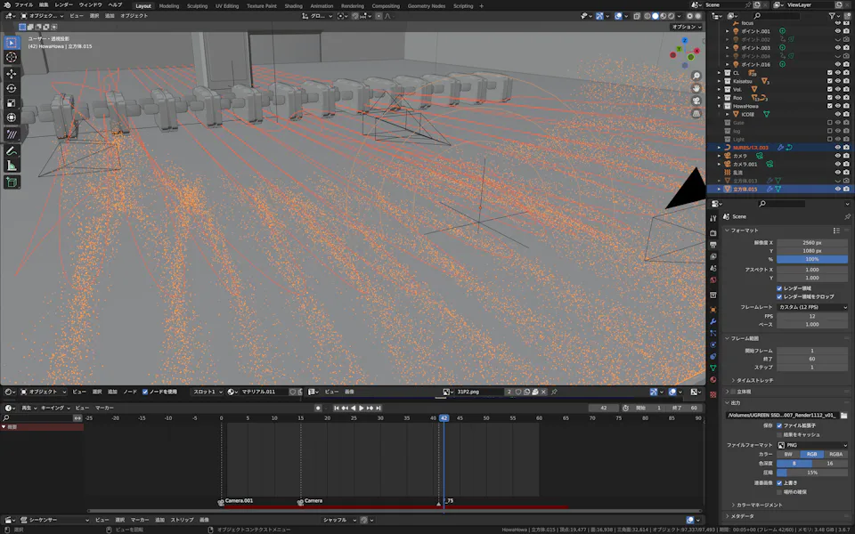 Particle expressions, including the ticket gate (C-07), are simulated internally, with each particle of light following the curve, utilizing standard Blender functions.